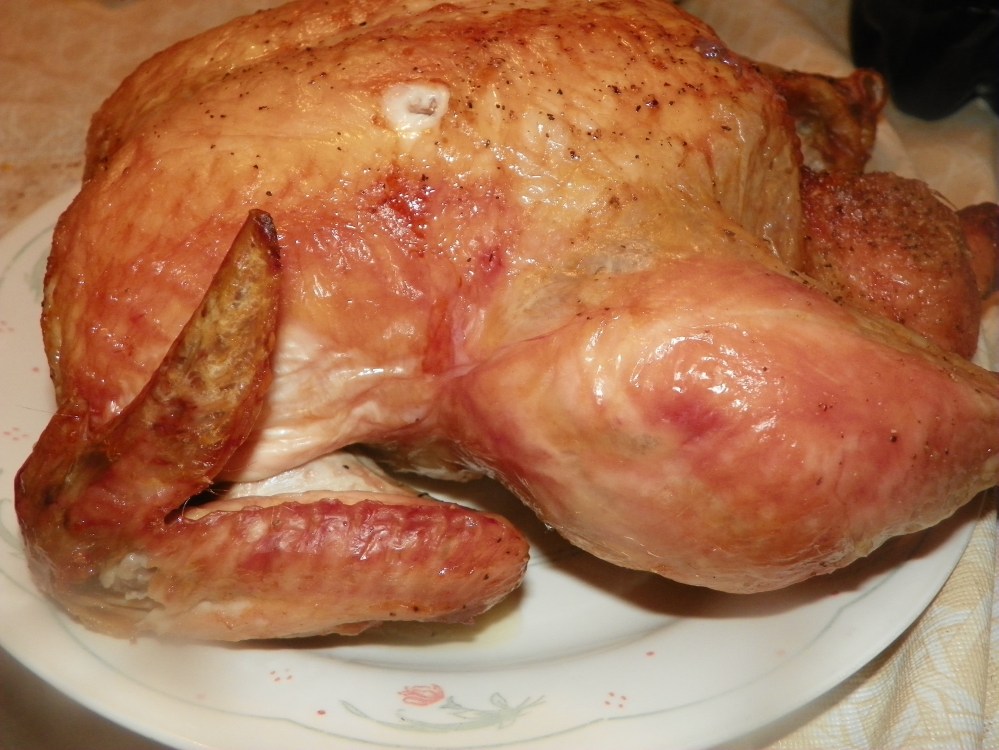 All I did was baste a chicken with butter, salt and pepper and baked it. The skin was crispy and flavorful. The chicken meat was moist and flavorful.