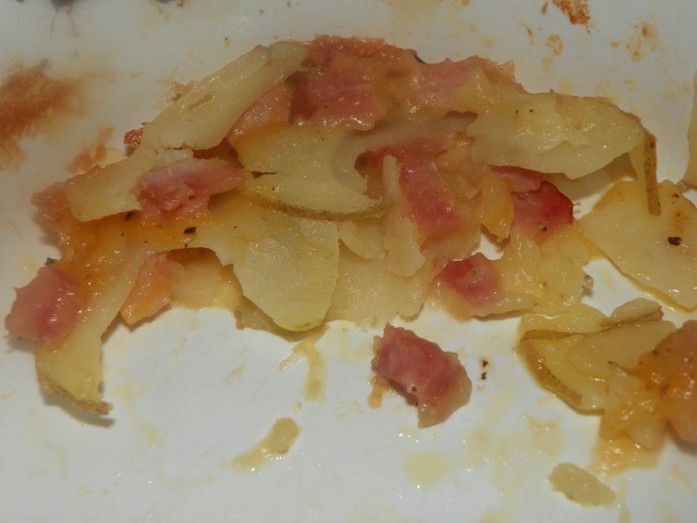 - In a casserole dish, sprayed with non-stick spray, later potatoes in the bottom of the dish. Follow with 1/3 of the cheese and then 1/3 of the ham. Lightly salt and pepper. Repeat layers until all ingredients are gone.