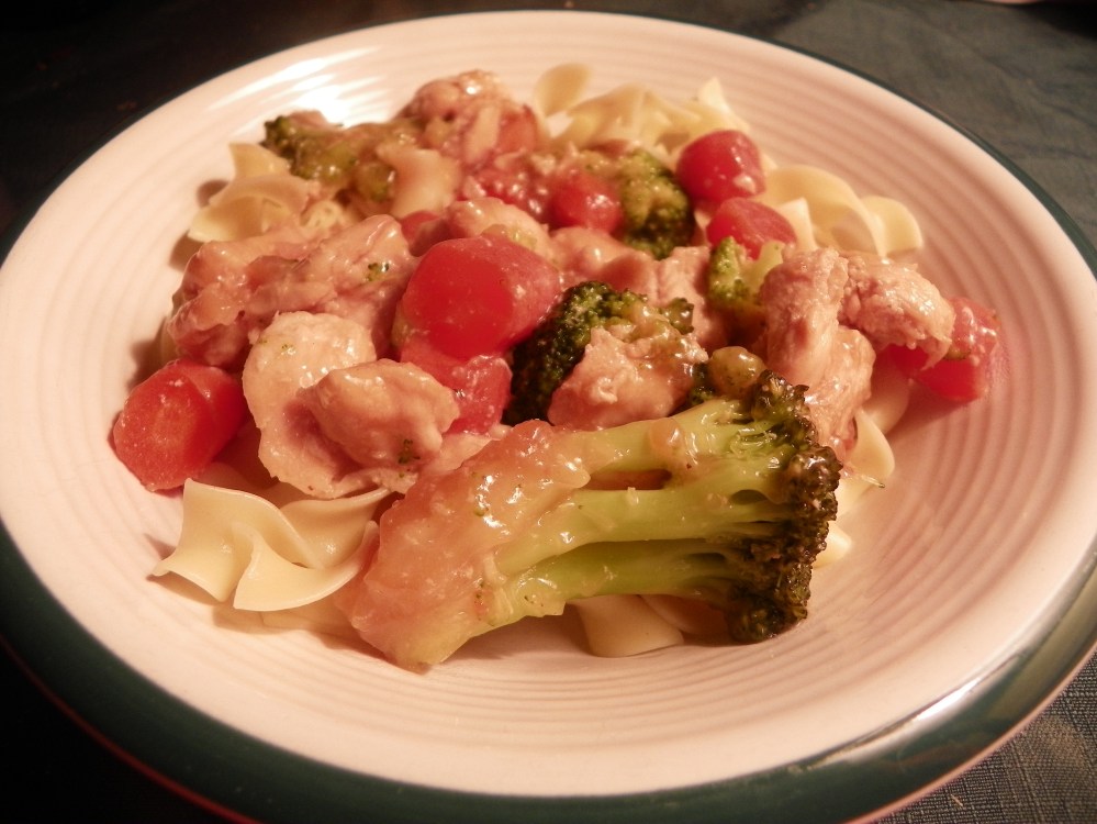 This dinner was a disaster from the start. I had a meeting on the night the dinner was to be cooked so I left instructions to follow the recipe on allrecipes.com for General Tsao’s Chicken. Well my better (cough, cough) half could not find the recipe so they cooked the chicken for me in a bit of oil. No batter. Ugh.