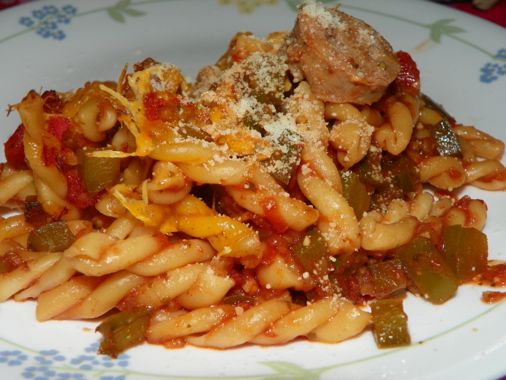 I had Italian Sausage in the freezer and needed a quick weeknight meal so it quickly became a pasta bake. The sausage was frozen so I sliced it to cook quicker. I threw in a pepper and onion near the end of when it was cooking to soften slightly. When the sausage was done cooking I drained off the fat and added a can (28 oz.) of crushed tomatoes, 2 tsp. minced garlic and 2 tsp. minced oregano. A dash of salt and pepper completed the sauce.