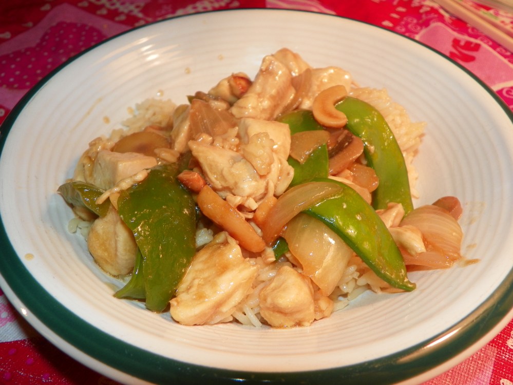 I searched for a recipe that I thought my family would eat and then ended up adapting the Recipe for Cashew Chicken from Food.com that I found for my family. My family voted this into their top three meals of the year to date. For them this is a big deal!