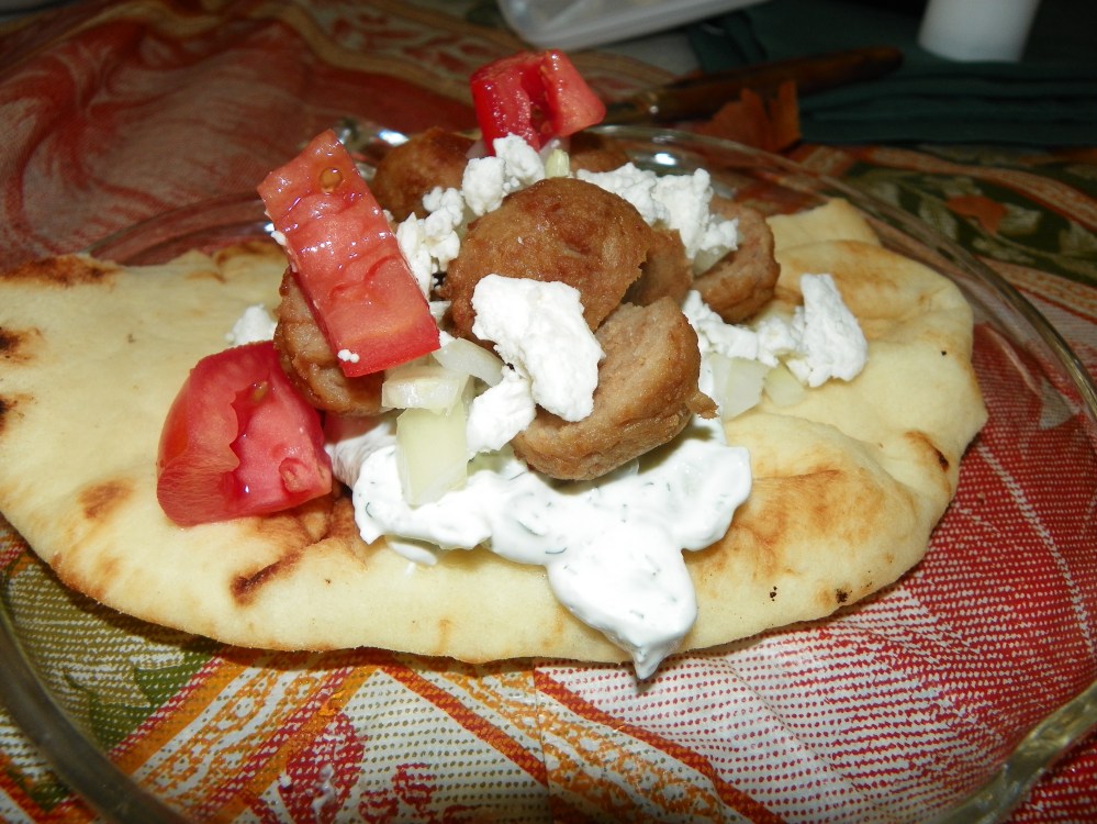 Diced tomatoes, onions and feta cheese over the top. I make my own Taziki dressing with sour cream, garlic, dill and chopped seeded cucumbers all to taste.