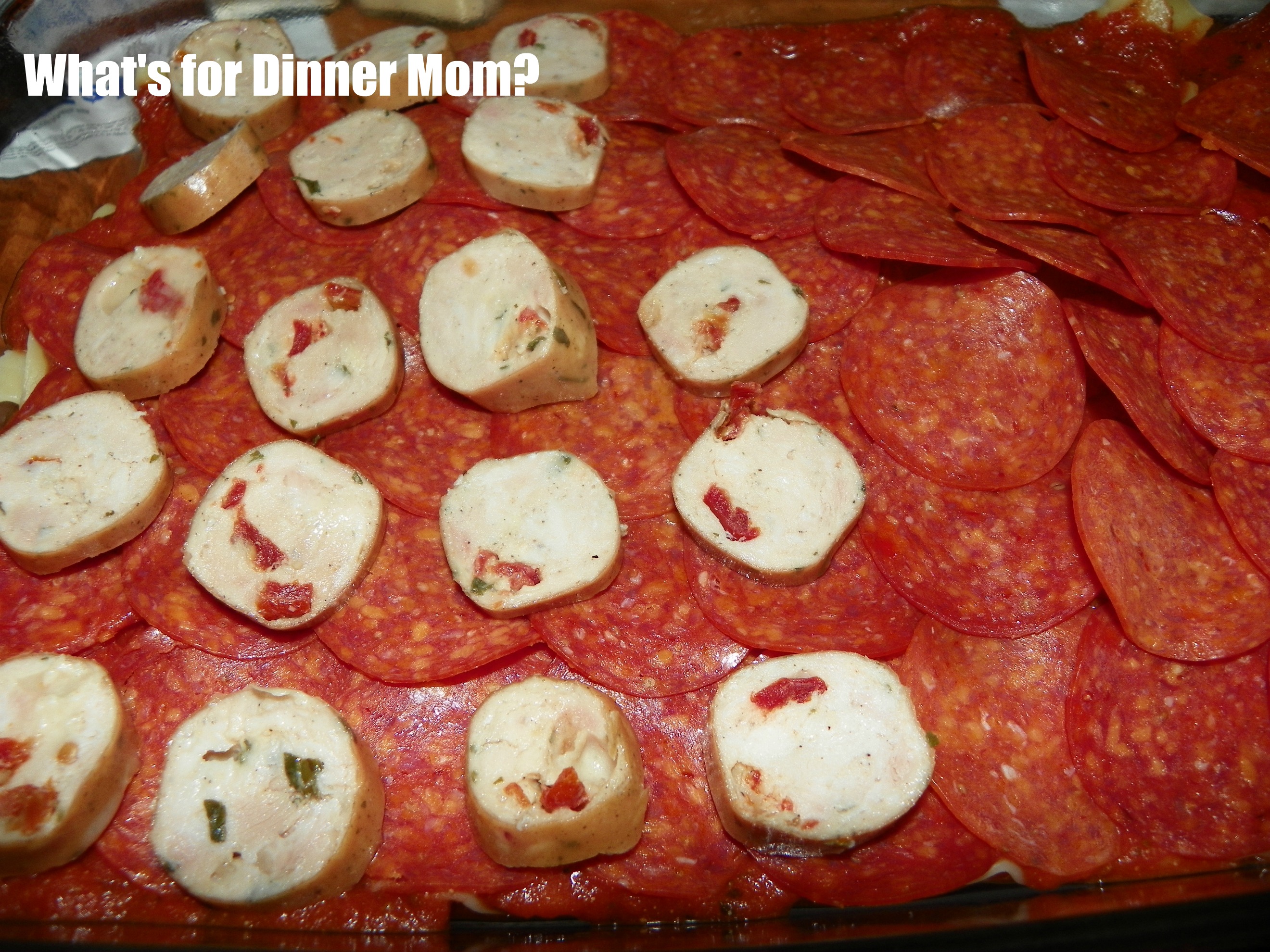- Add pepperoni slices in rows to cover all the noodles and sauce (picture below).