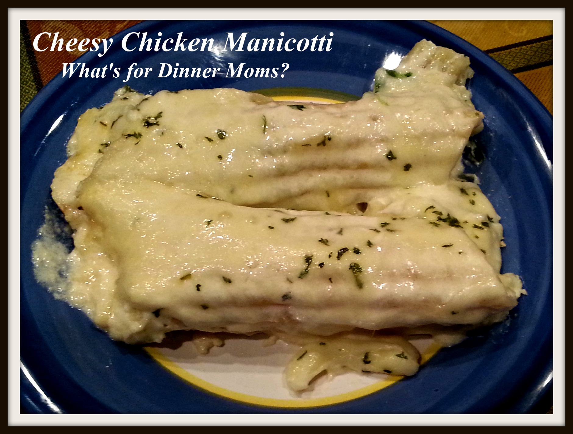This recipe started out to be a Chicken Alfredo Lasagna but when I didn’t have any lasagna noodles I needed to change quickly. So, it became Cheesy Chicken Manicotti.