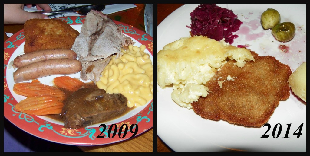What I love, and sometimes hate, about Walt Disney World restaurants is that no matter when you go if you have been to it before you pretty much know what you are going to get. They may tweak dishes from time to time or slightly change the menus with the seasons but especially in the buffet restaurants the food is consistent. This is a plate from our 2009 meal. Sausages, schnitzel, vegetable, macaroni and cheese, and beef. The same basic foods were there 5 years later though the macaroni and cheese recipe had, thankfully, changed.