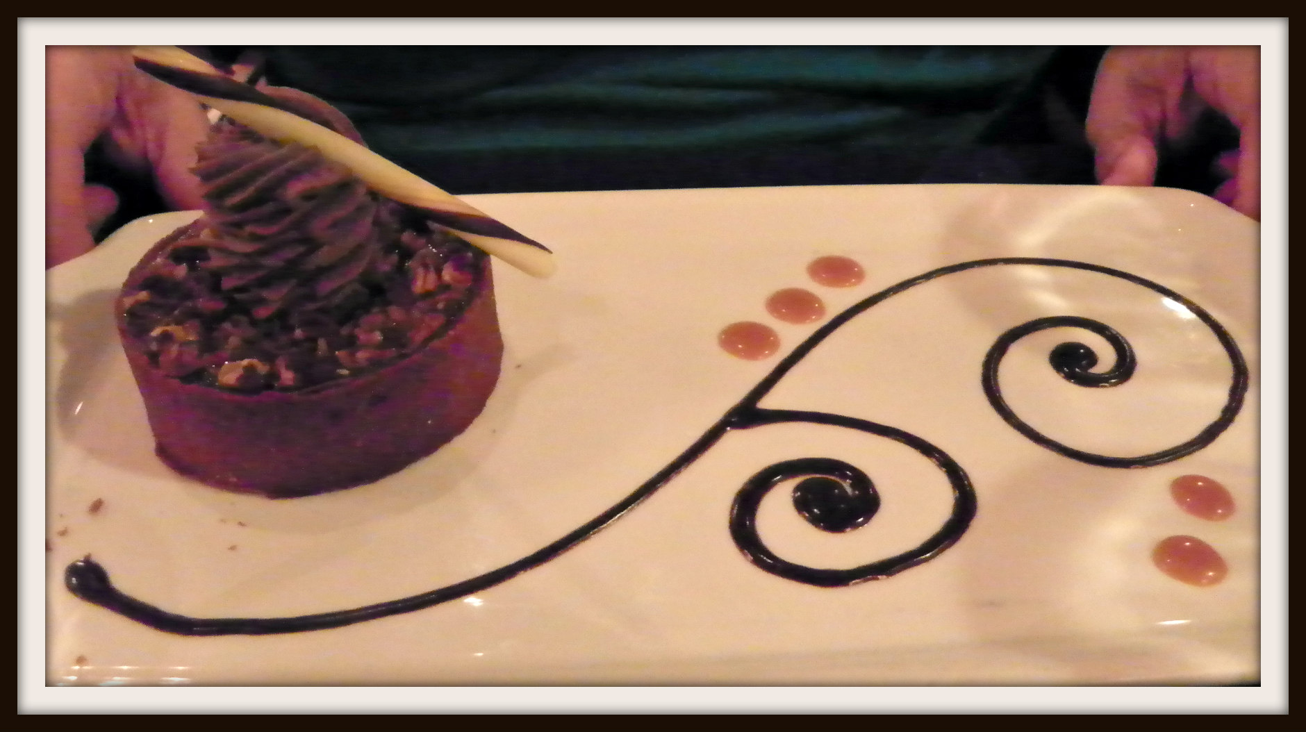As the night went on it was harder and harder to photograph the food. The sun had set and I really didn’t want to bother other diners with a flash going off 15-20 times during our meal. This was the Pecan Tart I ordered for dinner. It was delicious but heavy. After such a rich dinner I really should have chosen something lighter. The only part I was disappointed in was the chocolate “cup” that it was served in tasted manufactured. It did not have the luxurious taste I would have expected from the dish.