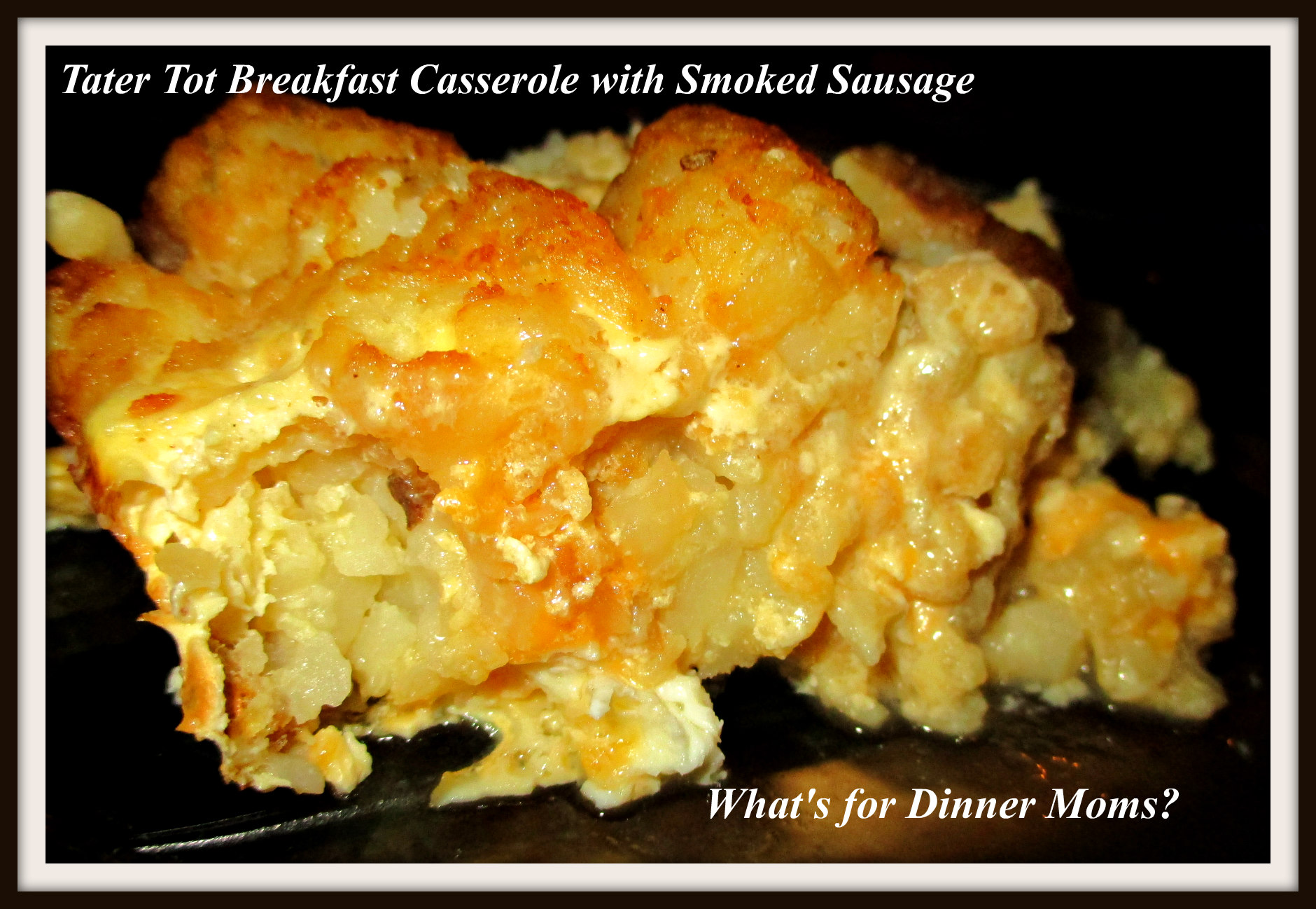 I had eggs that I needed to use. I decided that it was going to be breakfast for dinner night. Searching though my freezer I found one package of smoked sausage and a bag of tater tots! I felt like I won the lottery.