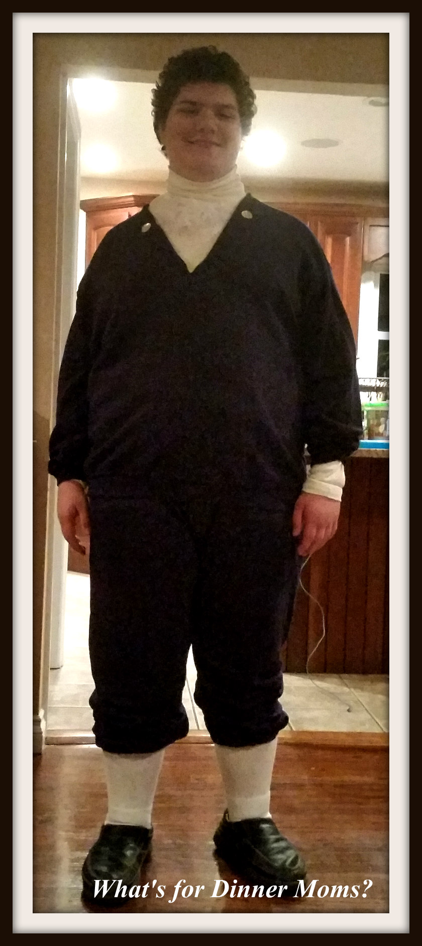 This was the night before decades day. I still had to add two buttons to the front of the sweatshirt. It is hard to see but I added lace to a turtleneck for the ruffled shirt. The bonus was the costume was comfortable for him AND he wore it for Halloween!