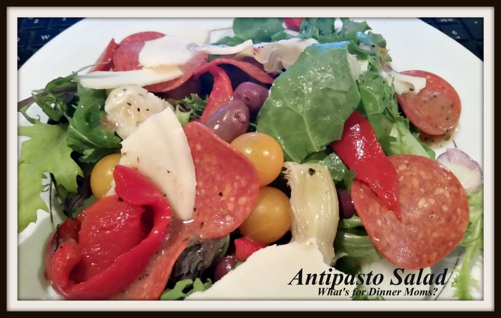 We love antipasto salads with roasted red peppers, kalamata olives, artichoke hearts, salami or pepperoni and provolone cheese. All the wonderful flavors together that we love. I had to look up if it was antipasto or antipasti. Antipasto is the singular form of the dish that you would have as a first course.