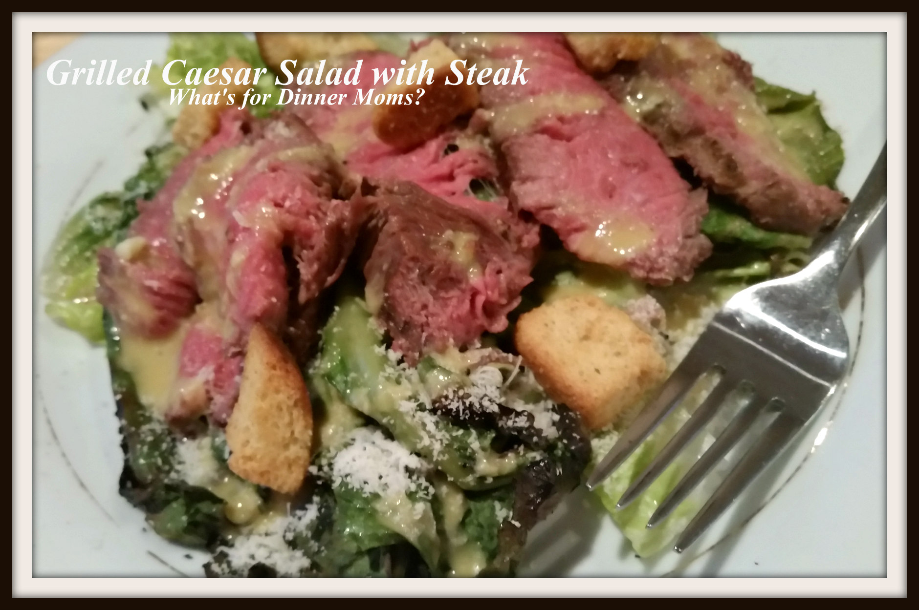 - To assemble salad: Cut bottoms of Romaine hearts and lay salad greens on plate. Lay steak slices over the greens. Sprinkle with extra Parmesan cheese and croutons. Drizzle salad dressing over the top and serve with extra dressing on the table to use as needed.