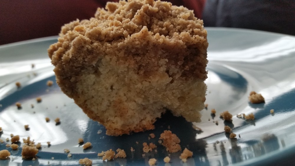 This is a delicious buttery cake with plenty of crumb topping (which is our favorite part). The crumb topping was about an inch thick over most of the cake which is hard to see in the picture. The girls loved that they made it and had it for breakfast the next morning.