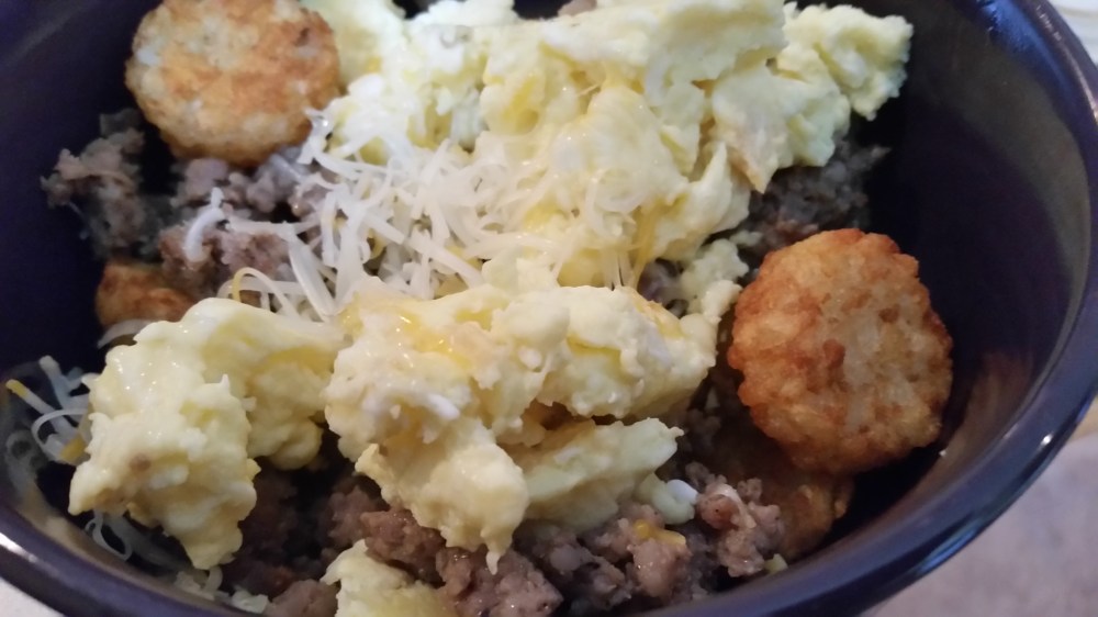 - To assemble bowls divide potato tots, breakfast sausage, and scrambled eggs among 4-6 bowls.