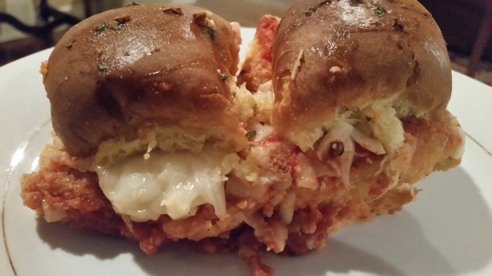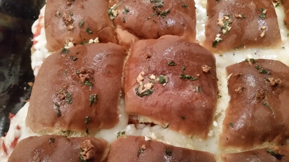 I took a page from my Garlic Butter Italian Sausage Sandwiches (click for link to original recipe) and made these more like a garlic bread Parmigiana. You can use the Hawaiian rolls for these but we prefer the plain dinner rolls (already baked) that come in the same 12 roll package. My family prefers to not have the sweet taste with the garlic butter but it is up to you.