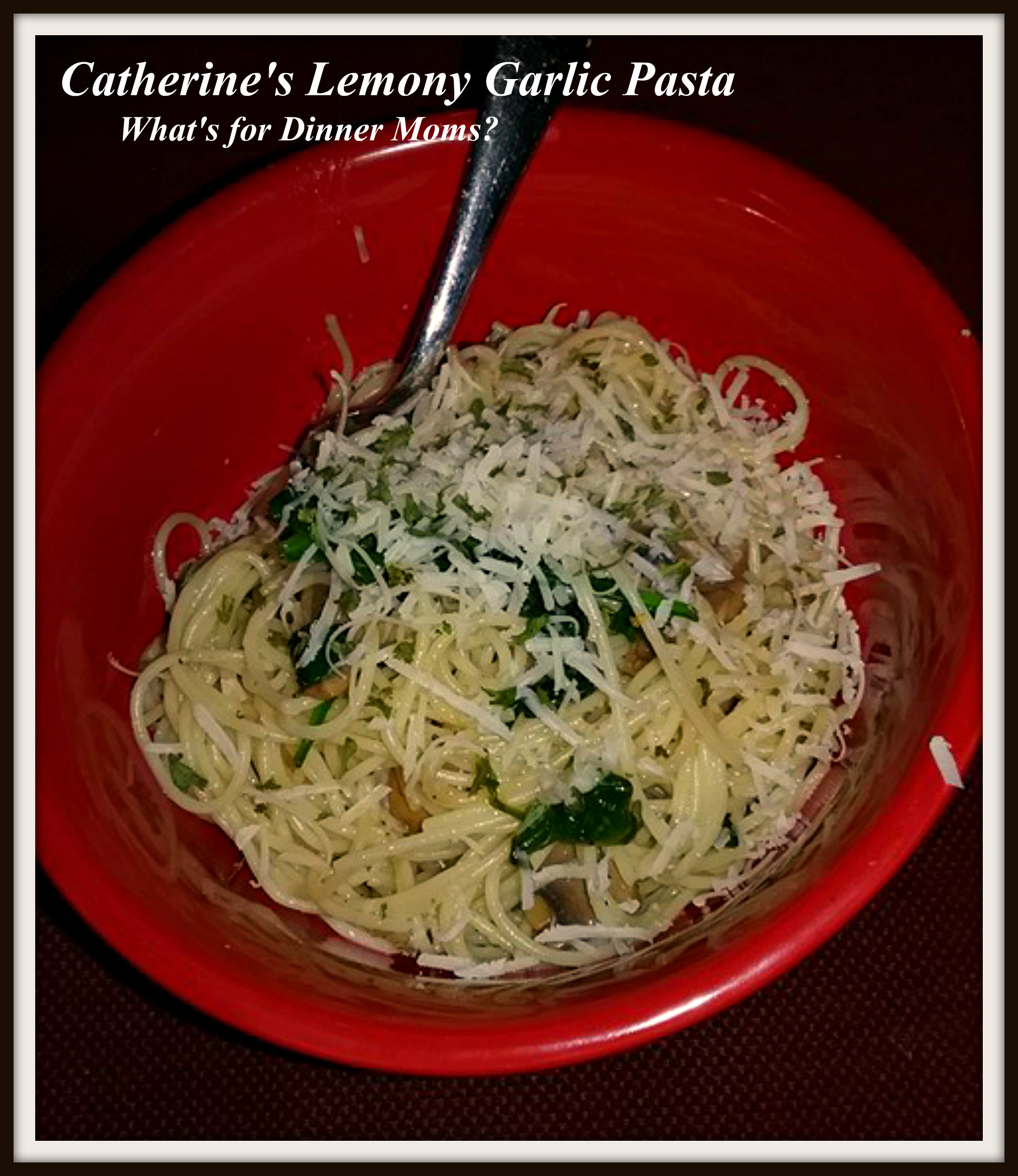 - Once pasta is cooked and drained add it to the skillet and toss with the spinach and garlic. Squeeze lemon juice over the top and toss. Sprinkle top with Parmesan cheese and coarse black pepper. Taste and adjust spices. Use powdered garlic if needed.