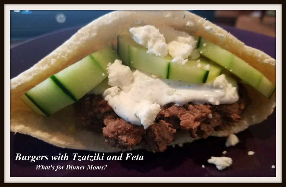 - Place a hamburger in a pita half top with tzatziki mixture, cucumbers and crumbled feta. Add tomatoes and onions as desired.
