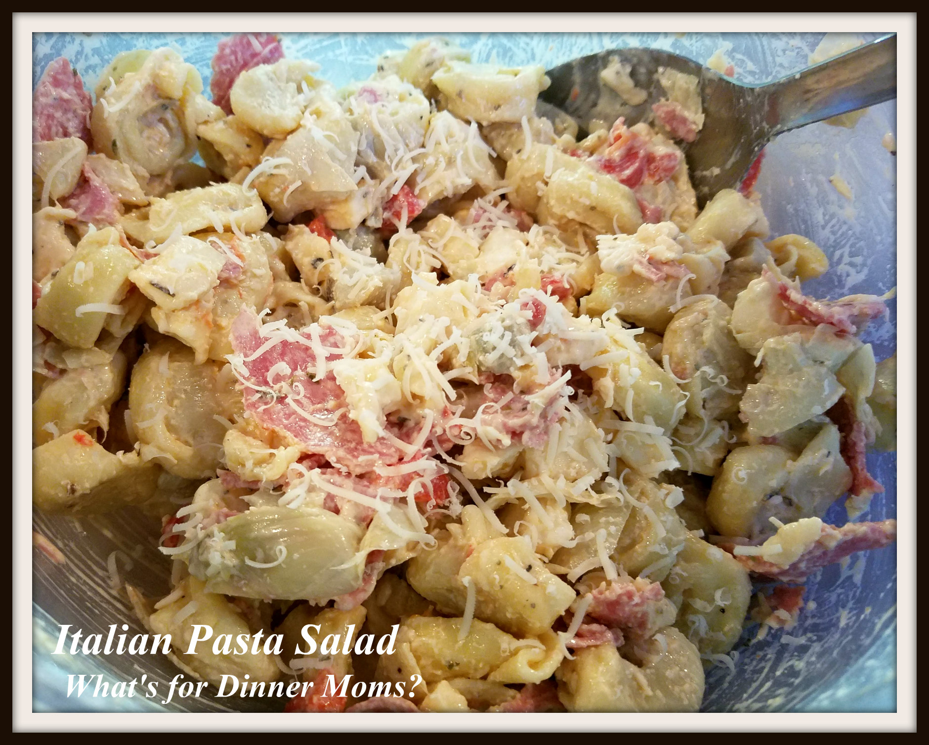 - In a large bowl, combine the cheese tortellini, salami, artichoke hearts, cheese, and peppers. Toss well to combine,