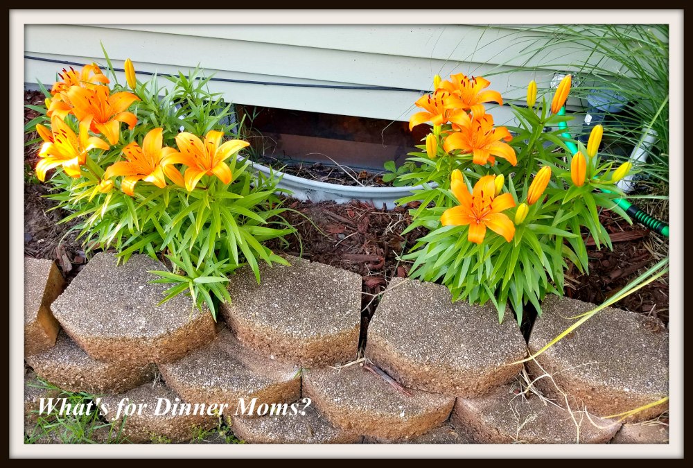 I love the lilies that we have planted in front flower beds. Lilies are one of my favorite flowers. They are so pretty. At our home in Rochester I had white, pink, and reddish lilies that I loved. We planted these three years ago and will divide them later this summer so that they don’t get too crowded. They have pretty much been eaten by the deer now but they were lovely!
