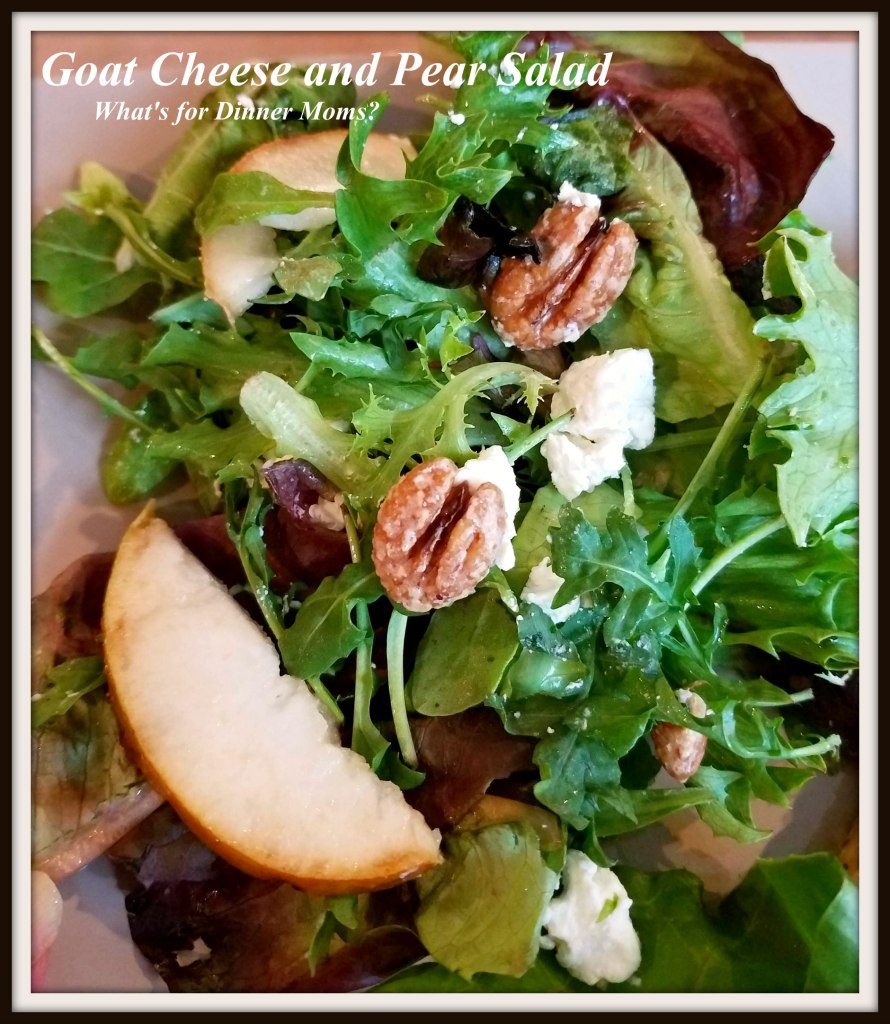 Goat cheese and pear salad with homemade dressing can be quickly put together on a busy night. My favorite tip is to candy your nuts earlier in the day or the night before to have this salad come together easily. Don’t like pears find a fruit you like that may go with the salad – blackberries would be great!